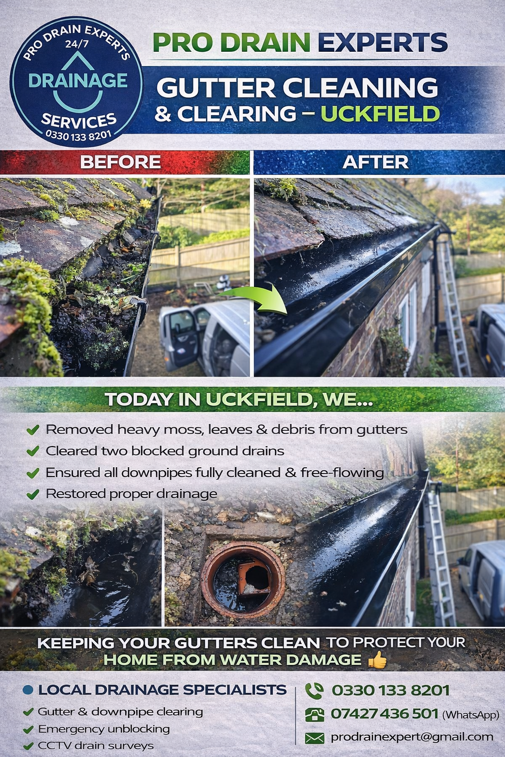ENSURED ALL DOWNPIPES FULY CLEANED & FREE FLOWING